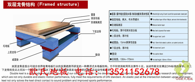 3、主副龍骨結(jié)構(gòu):此結(jié)構(gòu)的體育木地板,主龍骨和副龍骨相互銜接保證了體育地板整個結(jié)構(gòu)的穩(wěn)固性,再加上提升高度的標準,使其達到一個標準的運動效果,主要用于單位職工活動室,網(wǎng)球室,羽毛球室,或?qū)I(yè)要求不是很高的籃球館。例如:小學、中學籃球館等。