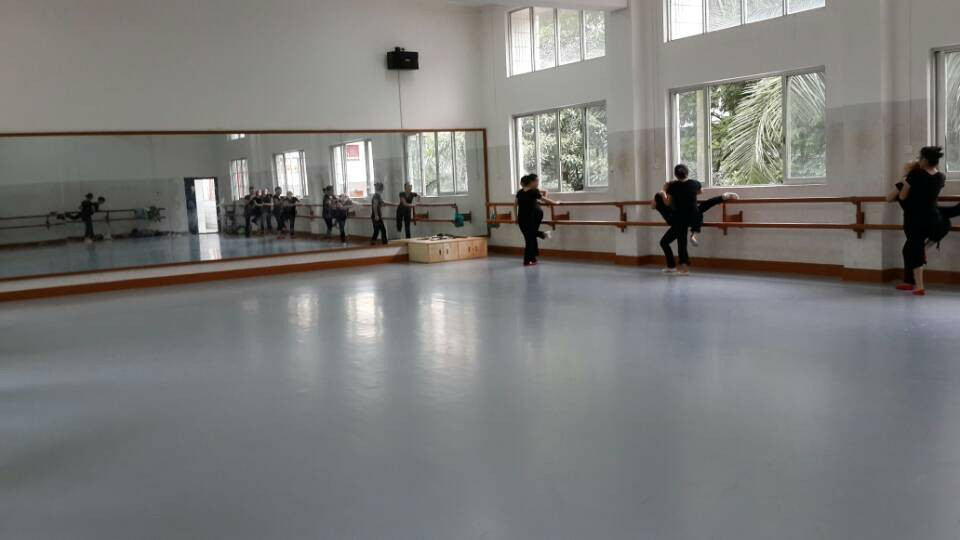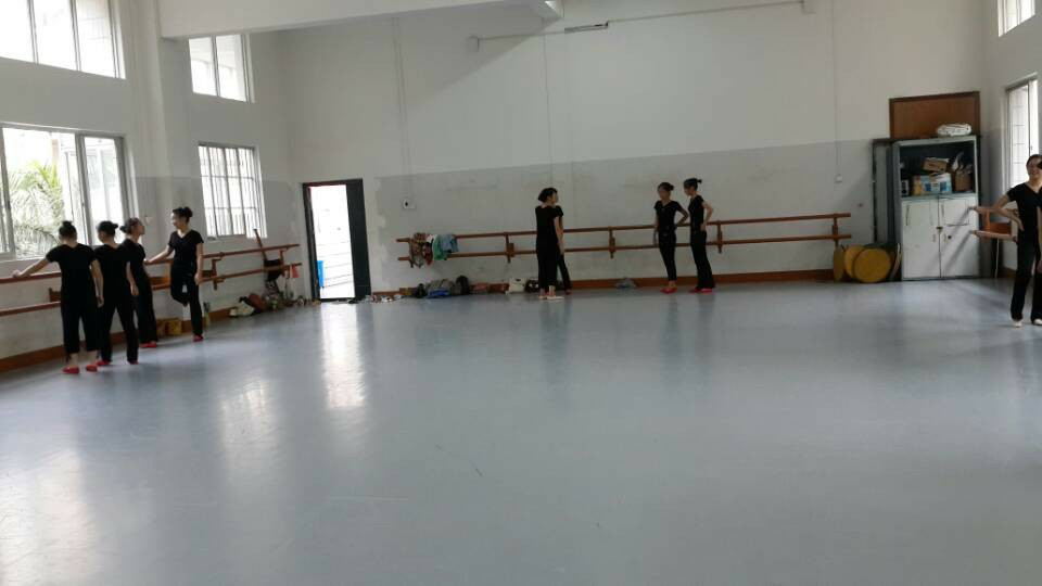 歐氏地板承建廣西師范學(xué)院舞蹈室地膠鋪設(shè),采用淺灰色舞蹈舞慕系列地膠