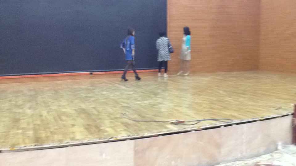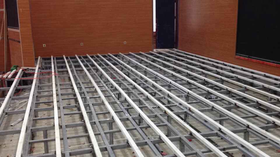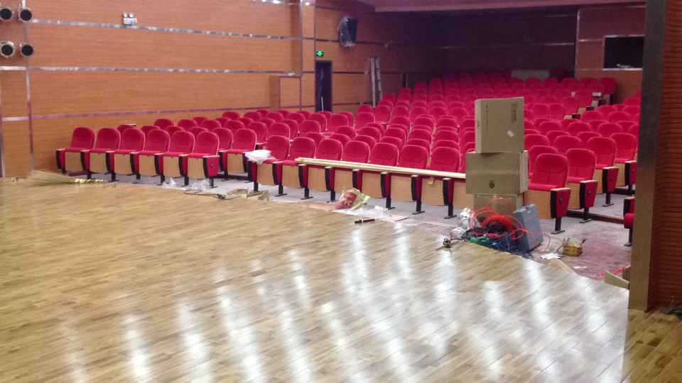 舞臺(tái)地板用材,面層為柞木,單層龍骨結(jié)構(gòu),鋪裝面積為103平方米。