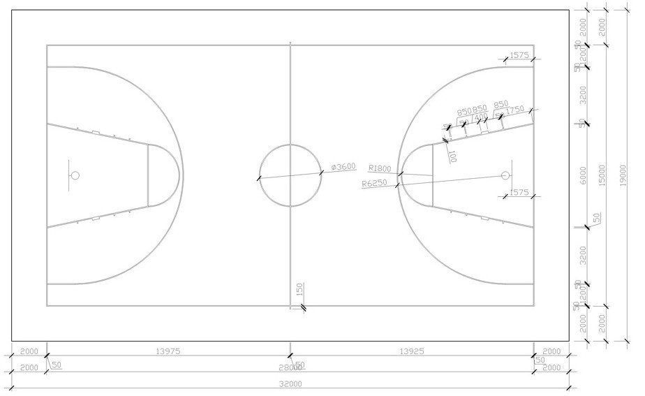 3、該圓弧的圓心要在對方球籃的中心垂直線與地面的交點上。圓心距端線內沿中點的距離為1.575米。